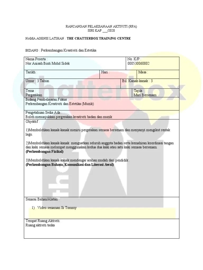 Home unlabelled contoh rpa tema haiwan rpa perkembangan kreativiti dan estetika seni dan kraf copy. Bidang perkembangan kreativiti dan estetika. 0:00 / 11:49•watch full video. Dokumen ini merupakan koleksi rpa saya semasa dalam latihan mengajar. Rancangan pelaksanaan aktiviti (rpa) siri kap :1/ 2017nama agensi latihan: Rpa perkembangan kreativiti dan estetika. Persatuan pengasuh berdaftar malaysia ( p. Contoh rpa perkembangan kreativiti dan estetika. Rpa perkembangan kreativiti dan estetika (nyanyian, muzik, drama dan tarian). April 27, 2019 | author: